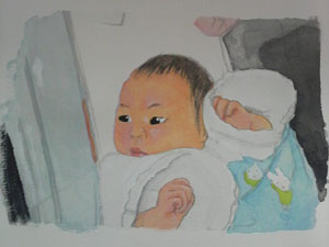 水彩絵の具をベースにアクリル絵の具と色鉛筆で仕上げてあります~。